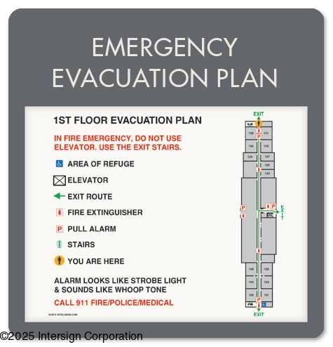 - Clearly identify exits, exit routes, fire extinguishers, pull alarms, stairs, and current location in the event of an emergency.