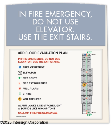 - Post directly above the elevator call button with the top of the sign 72" above floor to instruct people to use the stairs in the event of an emergency, not the elevator.