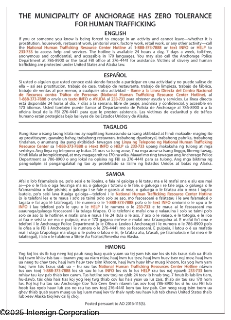Human Trafficking Notice - Alaska Code (English/Spanish/Tagalog/Samoa/Hmong)
