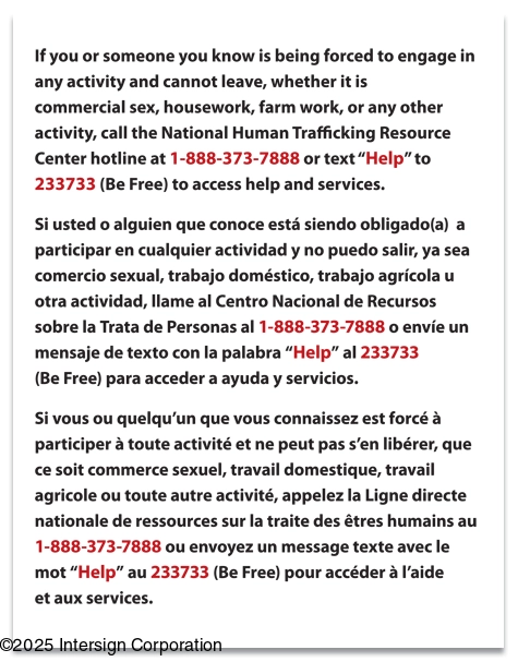 This Louisiana Human Trafficking Multilingual Notice (GSS-HT118C-LA) helps facilities raise awareness and comply with state regulations under LA Rev Stat § 15:541.1(5)(a) (2018). This sign provides required hotline information in English, Spanish, and French.
