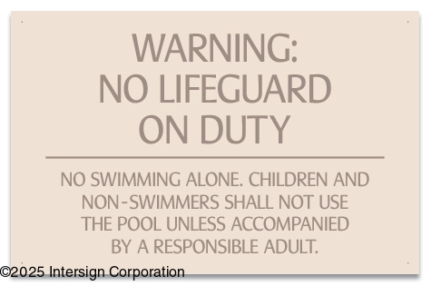 - Clear Graphics: The "WARNING: NO LIFEGUARD ON DUTY" message meets the required 4-inch minimum font height, while the "No swimming alone" and "Children and non-swimmers shall not use..." messages meet the 2-inch minimum. This sign is not required to have braille per ADA guidelines.